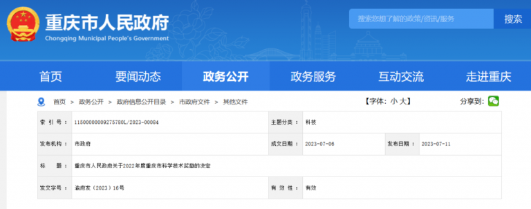 2022年度重慶市科學(xué)技術(shù)獎(jiǎng)勵(lì)的決定